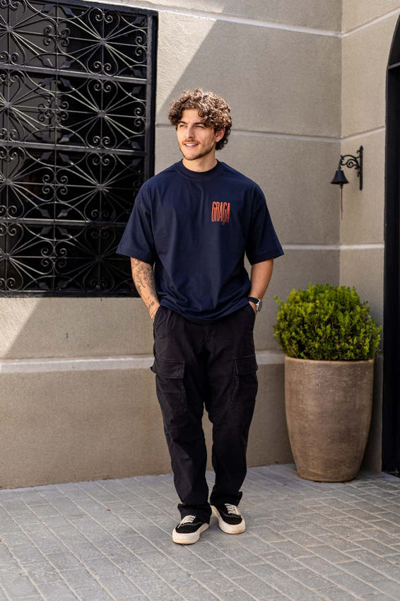 Camiseta Over com modelagem tradicional de camiseta Gola Alta em Ribana Canelada e costura ombro a ombro.