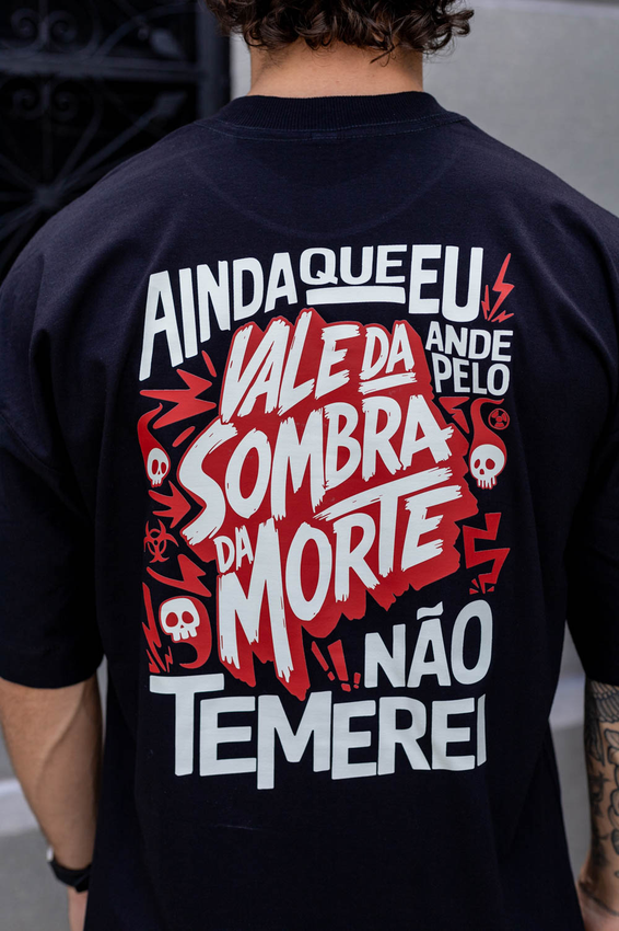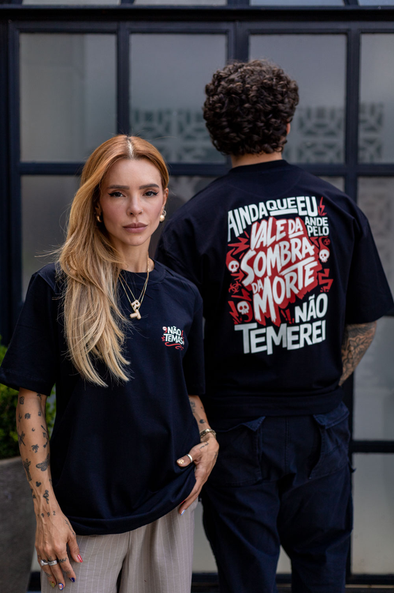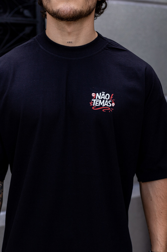 Camiseta Over com modelagem tradicional de camiseta Gola Alta em Ribana Canelada e costura ombro a ombro.