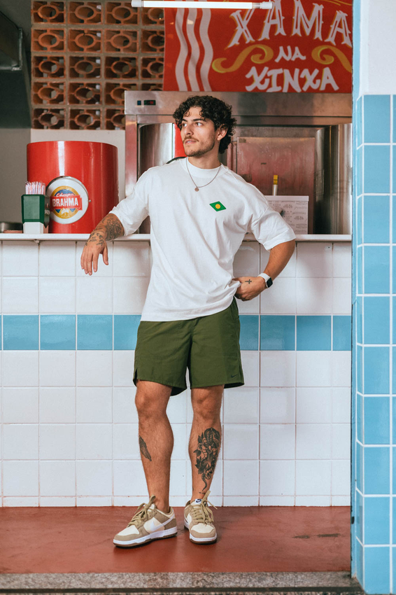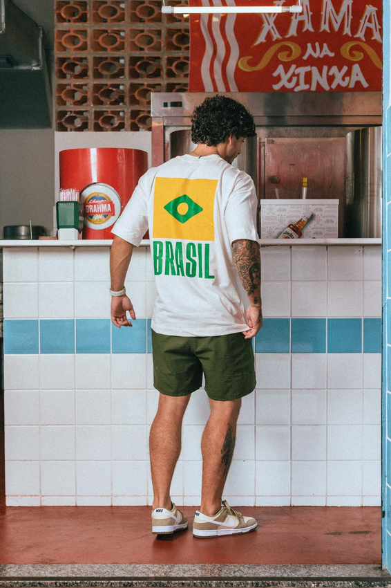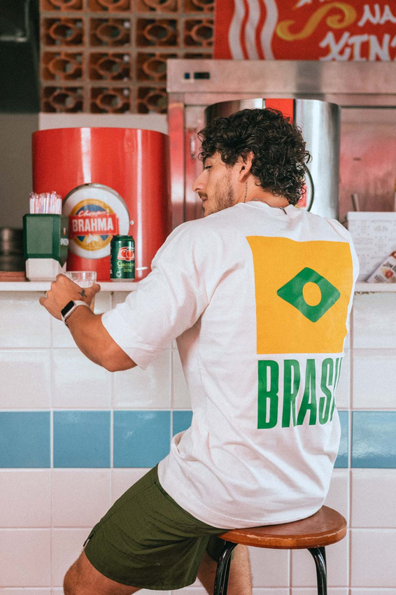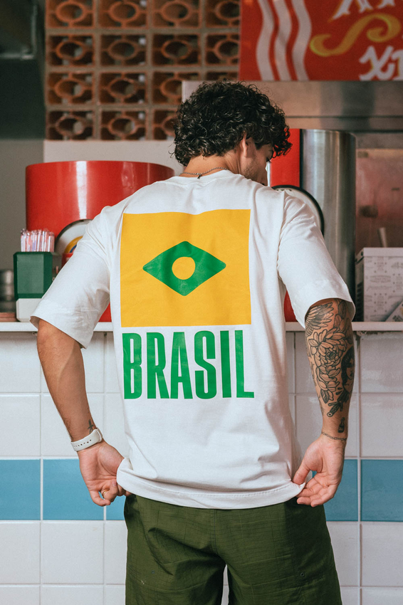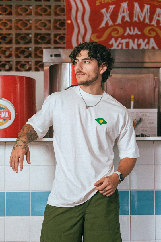 Camiseta Over com modelagem tradicional de camiseta Gola Alta em Ribana Canelada e costura ombro a ombro.