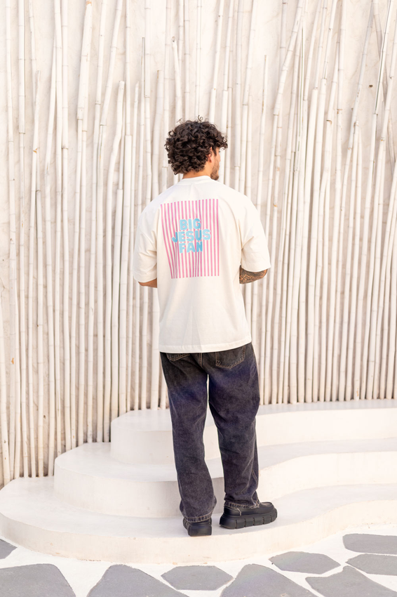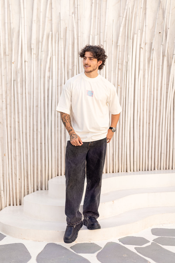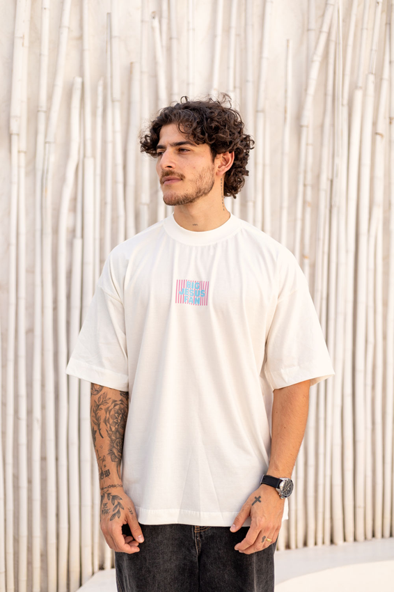 Camiseta Over com modelagem tradicional de camiseta Gola Alta em Ribana Canelada e costura ombro a ombro.
