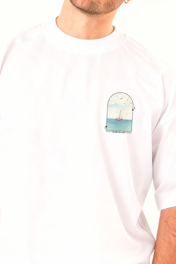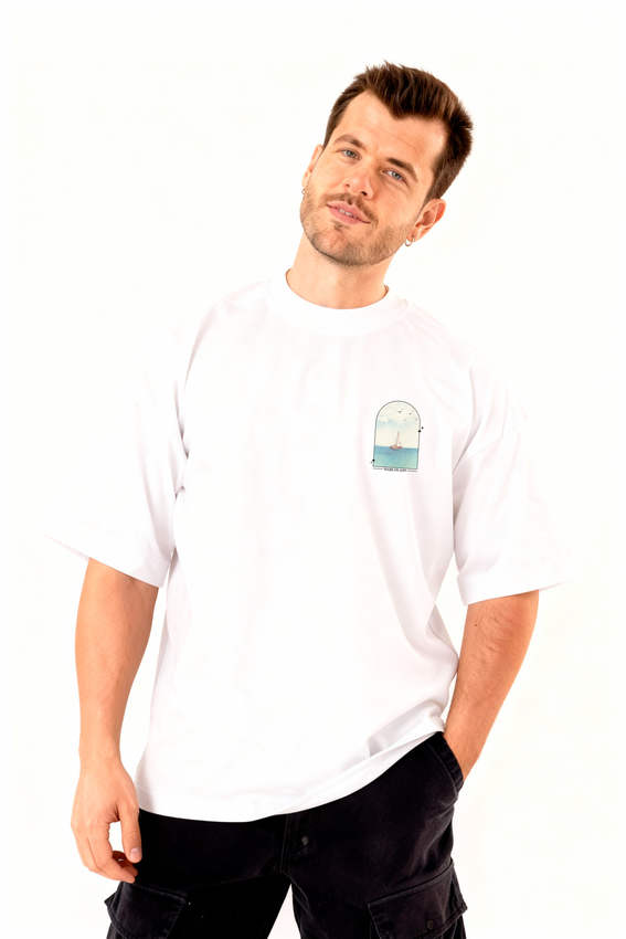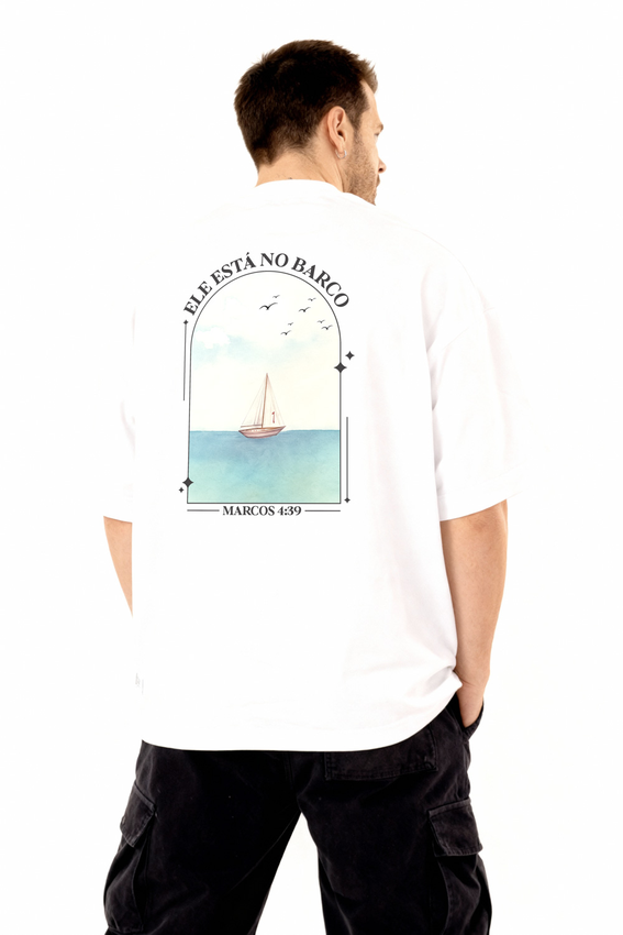 Camiseta Over com modelagem tradicional de camiseta Gola Alta em Ribana Canelada e costura ombro a ombro.