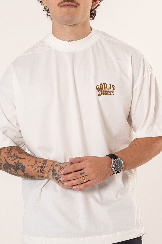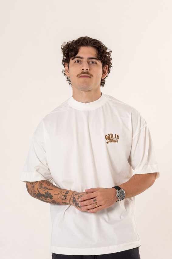 Camiseta Over com modelagem tradicional de camiseta Gola Alta em Ribana Canelada e costura ombro a ombro.