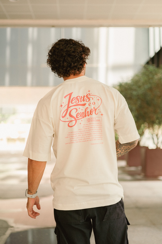 Camiseta Over com modelagem tradicional de camiseta Gola Alta em Ribana Canelada e costura ombro a ombro.