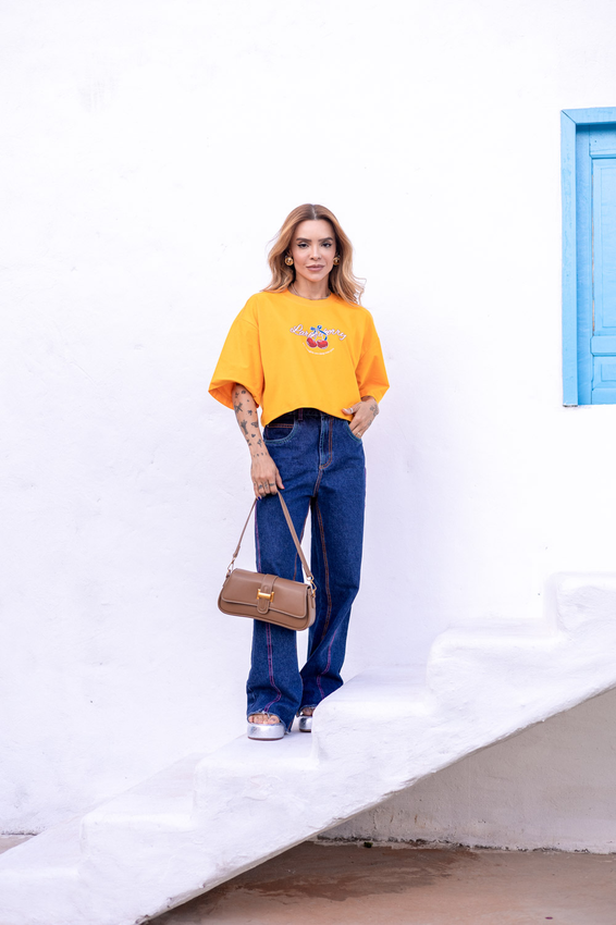 Cropped com modelagem tradicional de camiseta gola'' O''