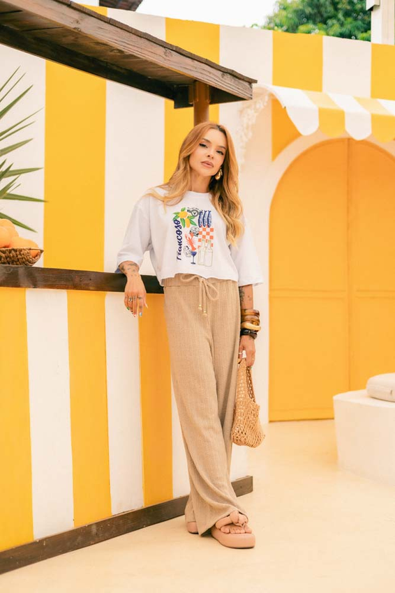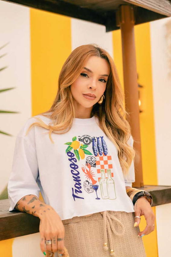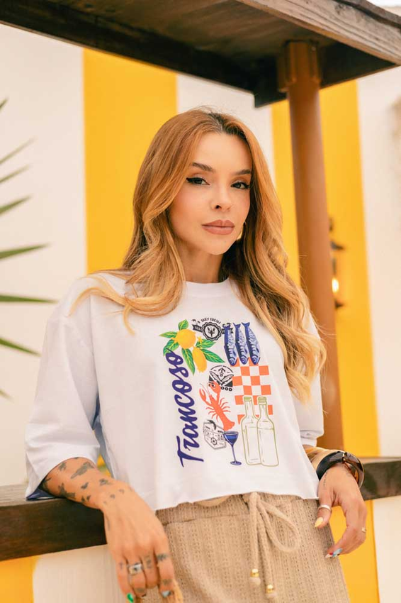 Cropped com modelagem tradicional de camiseta gola'' O''