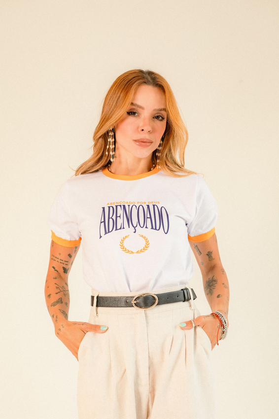 Tshirt com modelagem tradicional de camiseta gola''O'' com ribana, punhos e gola coloridos e costura ombro a ombro.