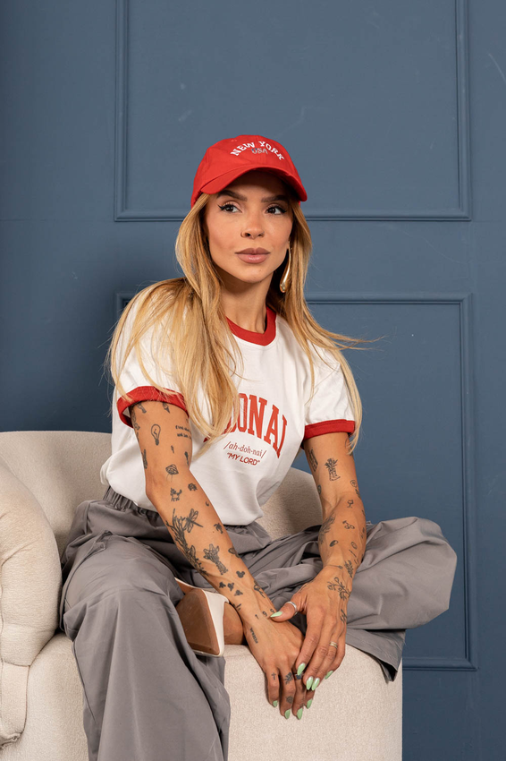 Tshirt com modelagem tradicional de camiseta gola''O'' com ribana, punhos e gola coloridos e costura ombro a ombro.