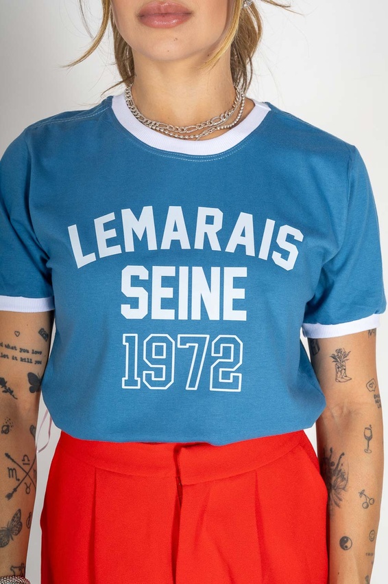 Tshirt com modelagem tradicional de camiseta gola''O'' com ribana, punhos e gola coloridos e costura ombro a ombro.