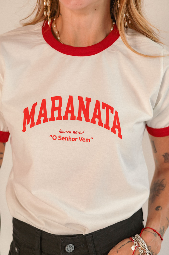 Tshirt com modelagem tradicional de camiseta gola''O'' com ribana, punhos e gola coloridos e costura ombro a ombro.