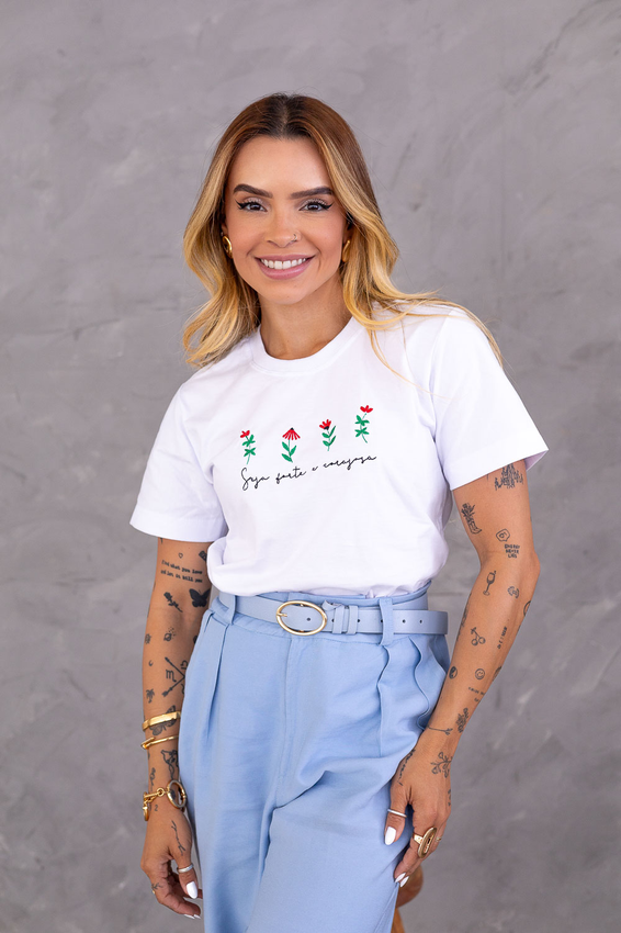 Tshirt com modelagem tradicional de camiseta gola''O'' em Riabana Canelada e costura ombro a ombro.
