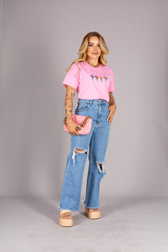 Tshirt com modelagem tradicional de camiseta gola''O'' em Riabana Canelada e costura ombro a ombro.
