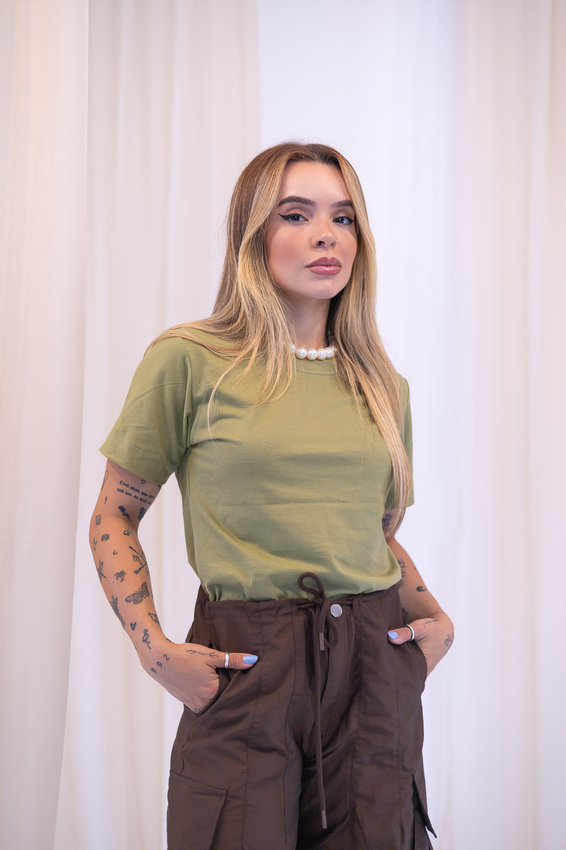 Tshirt com modelagem tradicional de camiseta gola''O'' com Gola em Ribana Canelada e costura ombro a ombro.