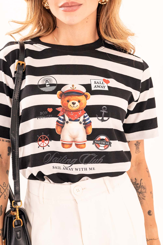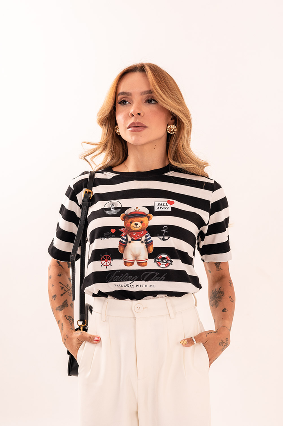 Tshirt com modelagem tradicional de camiseta gola''O'' com punho e gola em ribana e costura ombro a ombro.