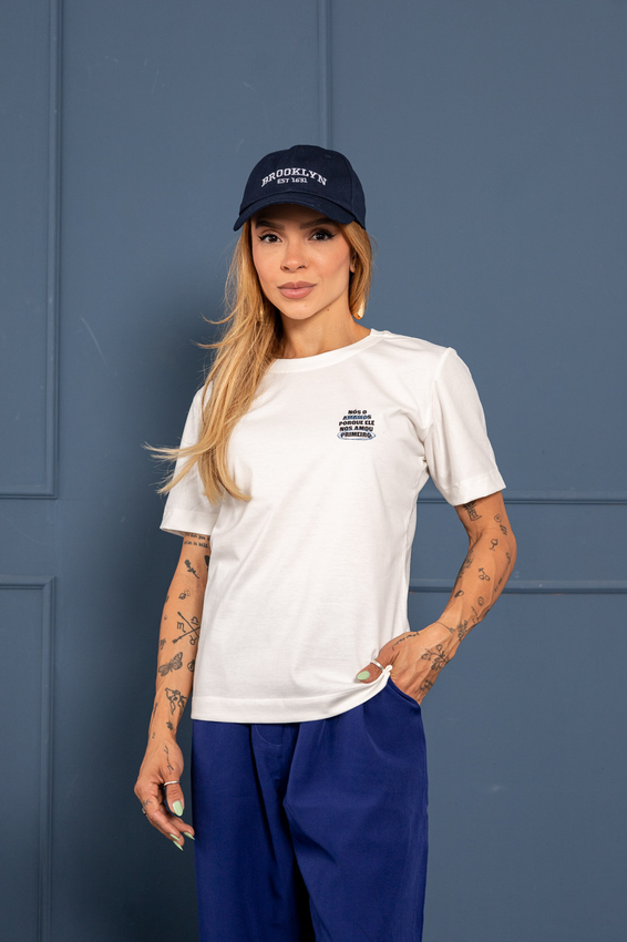 Tshirt com modelagem tradicional de camiseta gola''O'' com Gola em Ribana Canelada e costura ombro a ombro.
