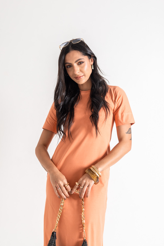 Vestido Midi de Mangas com modelagem tradicional de gola''O'' com ribana e costura ombro a ombro.