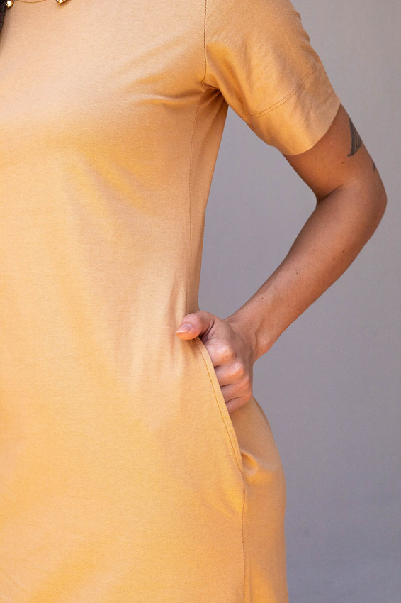 Vestido Midi de Mangas com modelagem tradicional de gola''O'' com ribana e costura ombro a ombro.