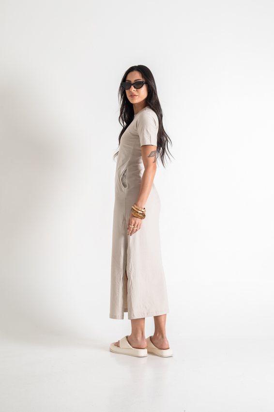 Vestido Midi de Mangas com modelagem tradicional de gola''O'' com ribana e costura ombro a ombro.
