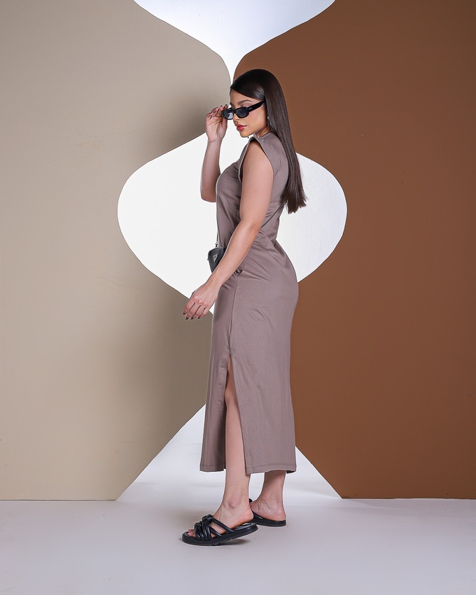 Vestido Midi Mudcle com modelagem tradicional de gola''O'' com ribana e costura ombro a ombro.