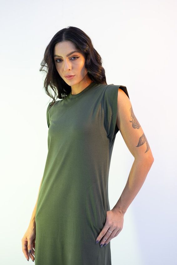 Vestido Midi Mudcle com modelagem tradicional de gola''O'' com ribana e costura ombro a ombro.