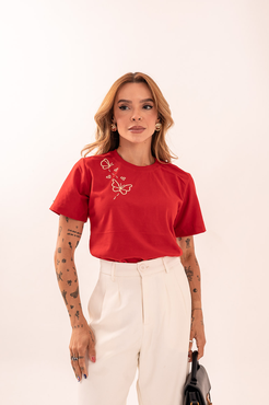 Tshirt Bordada Florzinhas Vermelhas Mangas