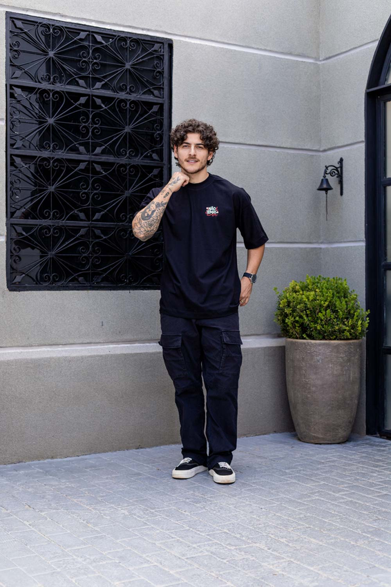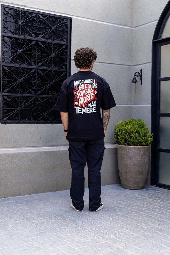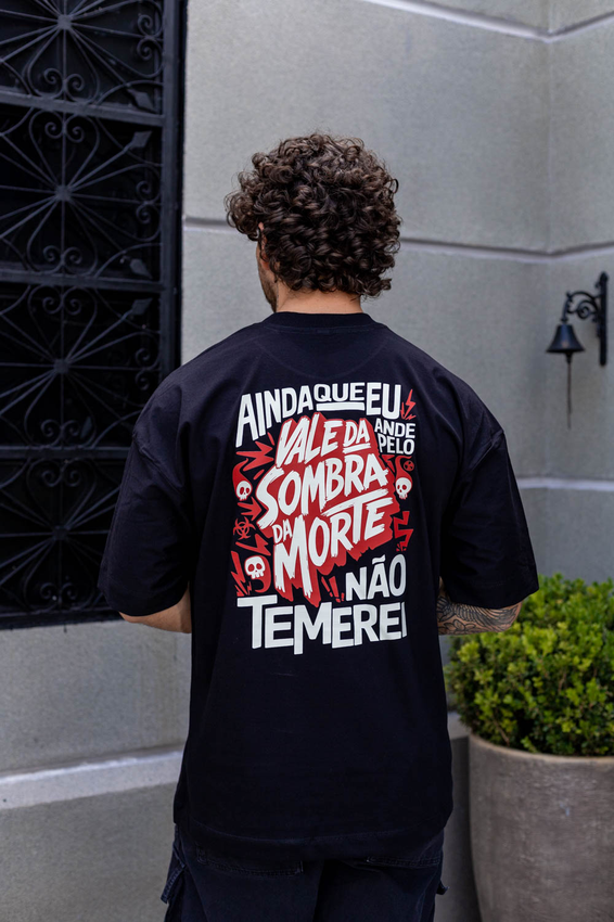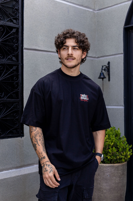 Camiseta Over com modelagem tradicional de camiseta Gola Alta em Ribana Canelada e costura ombro a ombro.