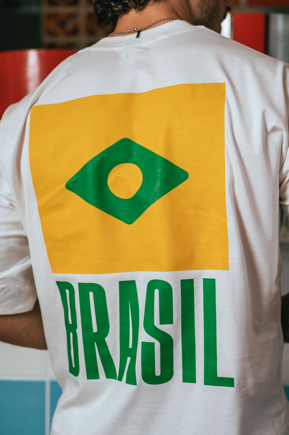 Camiseta Over com modelagem tradicional de camiseta Gola Alta em Ribana Canelada e costura ombro a ombro.