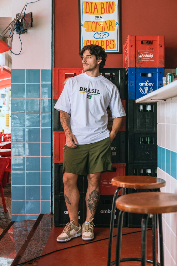Camiseta Over com modelagem tradicional de camiseta Gola Alta em Ribana Canelada e costura ombro a ombro.
