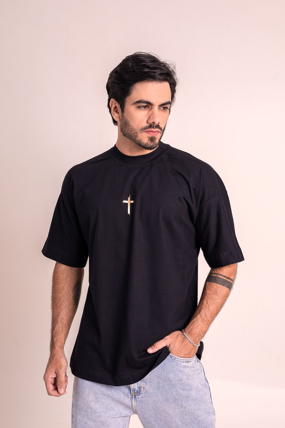 Camiseta Over com modelagem tradicional de camiseta Gola Alta em Ribana Canelada e costura ombro a ombro.