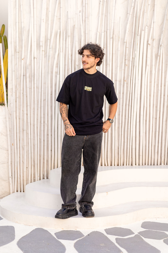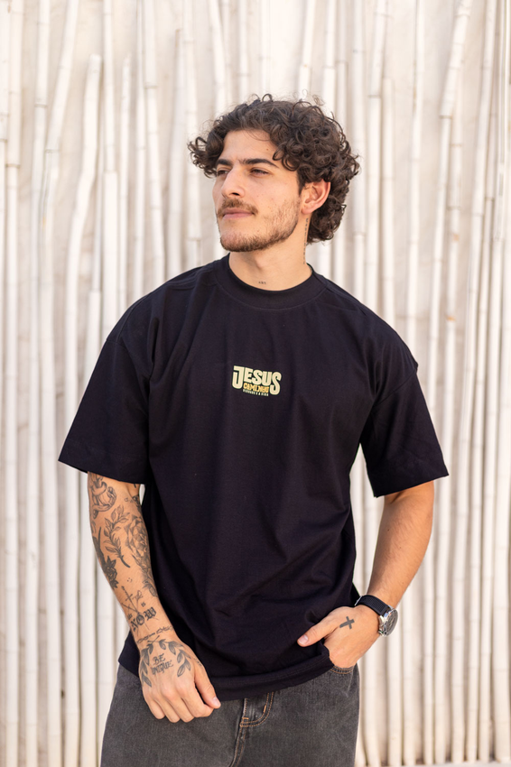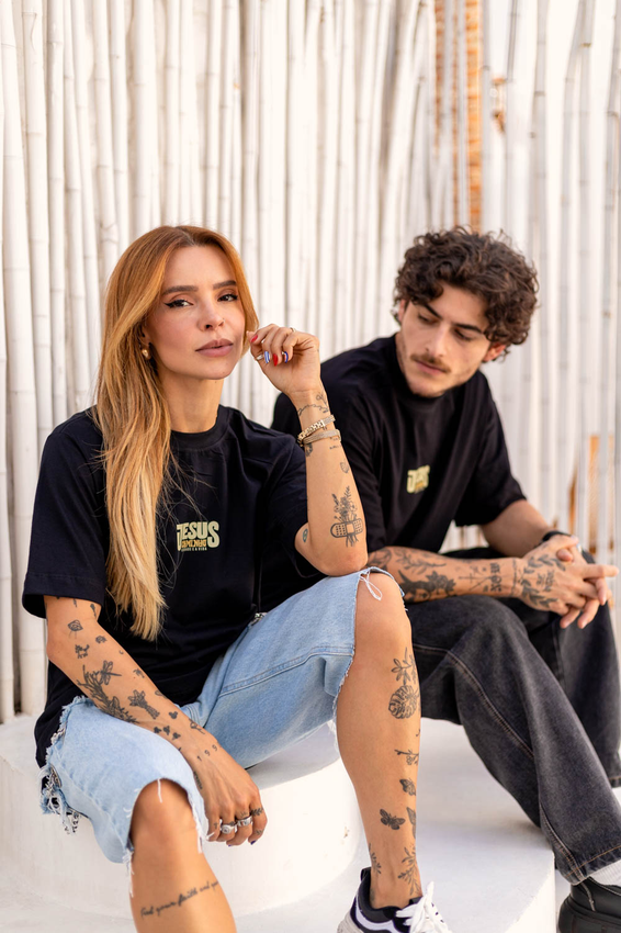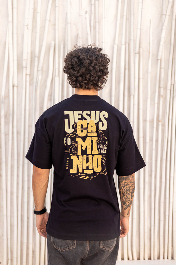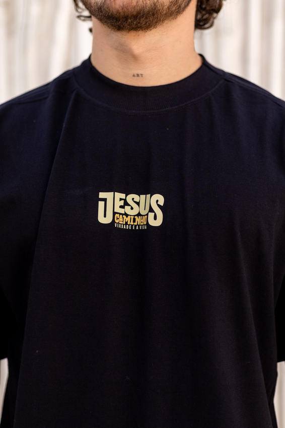 Camiseta Over com modelagem tradicional de camiseta Gola Alta em Ribana Canelada e costura ombro a ombro.