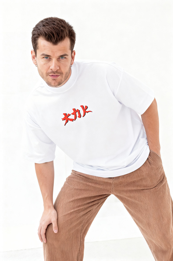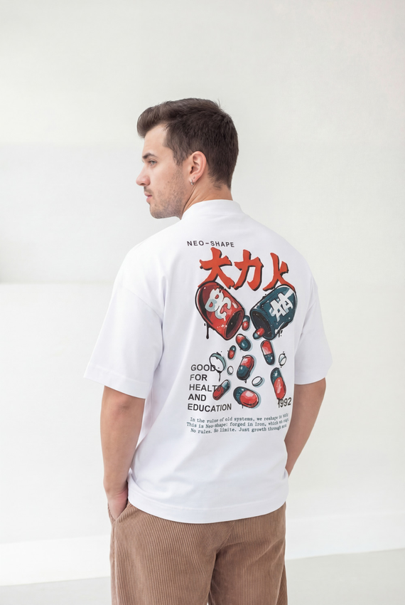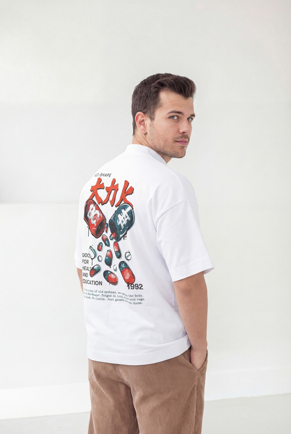 Camiseta Over com modelagem tradicional de camiseta Gola Alta em Ribana Canelada e costura ombro a ombro.