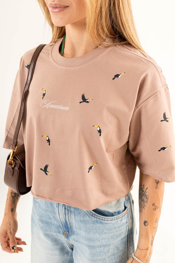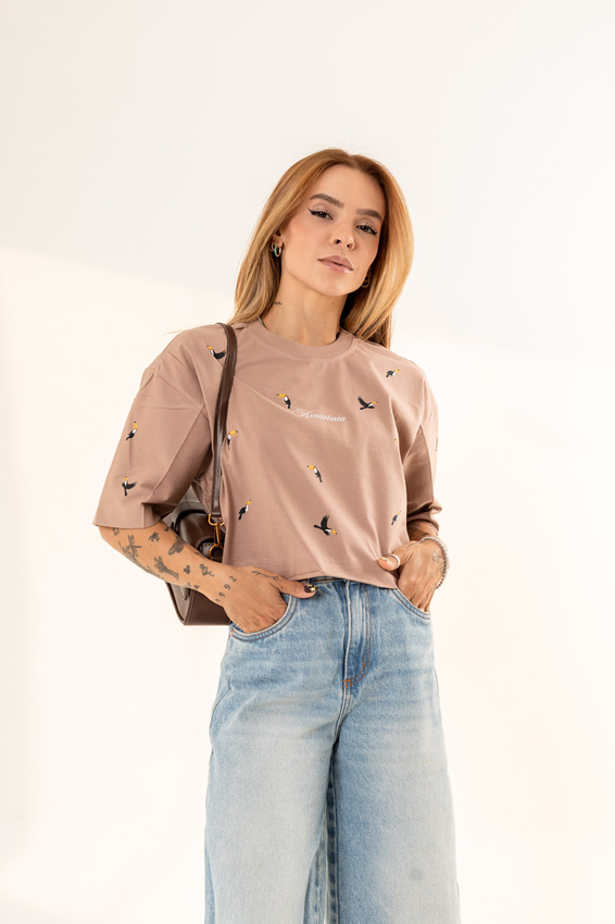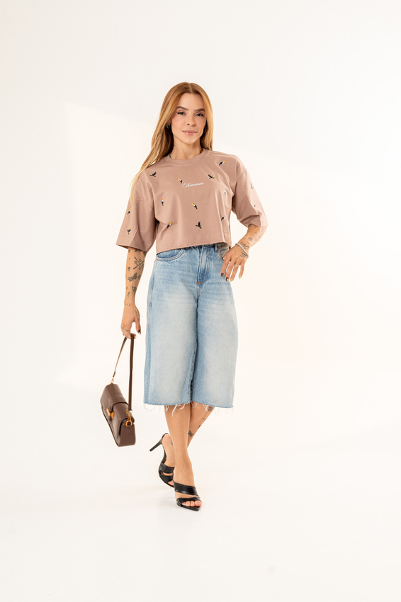 Cropped com modelagem tradicional de camiseta gola'' O''
