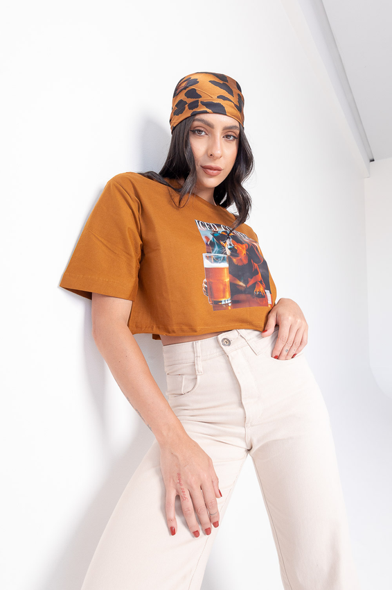 Cropped com modelagem tradicional de camiseta gola'' O''
