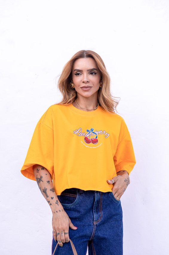 Cropped com modelagem tradicional de camiseta gola'' O''