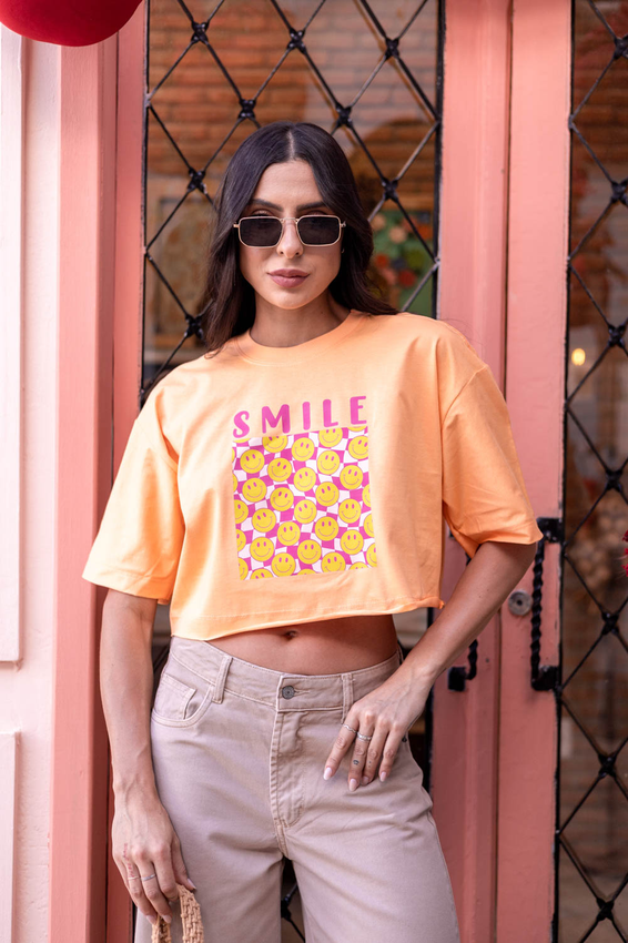 Cropped com modelagem tradicional de camiseta gola'' O''