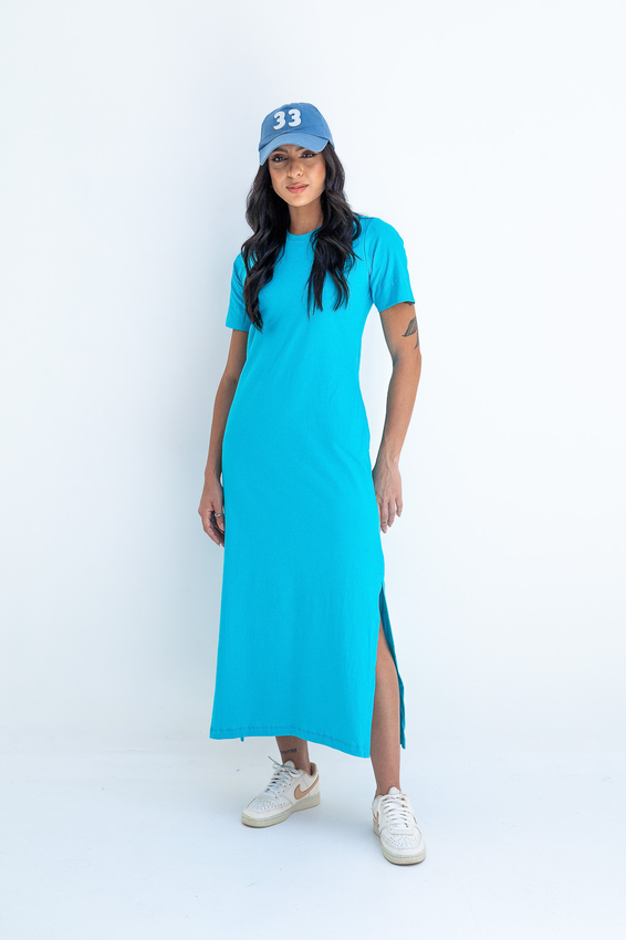 Vestido Midi de Mangas com modelagem tradicional de gola''O'' com ribana e costura ombro a ombro.