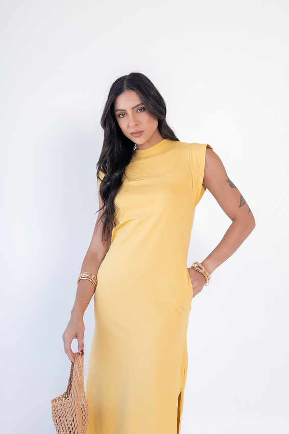 Vestido Midi Mudcle com modelagem tradicional de gola''O'' com ribana e costura ombro a ombro.