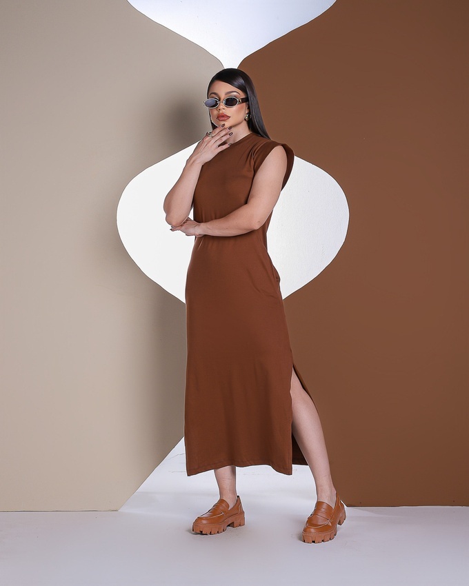 Vestido Midi Mudcle com modelagem tradicional de gola''O'' com ribana e costura ombro a ombro.